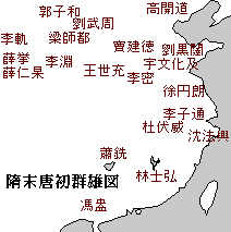 唐 武徳1 | 李淵が隋の恭帝(位617-618)から禅譲を受けて立つ(高祖)。国号は唐。 裴寂・劉文静が律令を修定した。 六月、李世民が尚書令となり、裴寂が右僕射となり、劉文静が納言となった。 李建成が皇太子となり、李世民が秦王となり、李元吉が斉王となった。 薛挙が涇州に来攻したので、李世民がこれをはばんだ。 李密が王世充に敗れて唐に帰順した。 十一月、黎陽の徐世勣に帰順を勧め、国姓の李を与えた。 十二月、李密(582-618)が東帰をはかり、中途に捕らえられて処刑された。 この年、唐朝は郡を廃して州を設け、太守を刺史に改めた。 王通(584-618) | 皇泰1 | 王世充らが東都洛陽に越王楊侗を擁立した。王世充は納言・鄭国公となった。 王世充らは宇文化及を恐れ、李密の罪を赦して魏国公に封じた。 九月、王世充が李密と偃師で戦い、李密を破った。 | 六月、宇文化及が黎陽にいたり、徐世勣を囲んだ。 七月、李密が宇文化及を破った。宇文化及は魏県に逃亡し、秦王浩を殺して帝を称した。 薛挙が没し、子の薛仁杲が継いだ。薛仁杲は李世民に敗れて降ったのち殺された。 呉興太守沈法興が江南十余郡を定め、江南道大総管を称す。 蕭銑が帝を称し、江陵を都とした。 竇建徳が国号を夏とす。 李軌、帝を称す。 朱粲が冠軍で帝を称す。 |